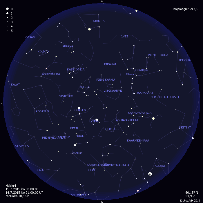 Heinäkuussa taivaalla näkyvät lähinnä vain kaikkein kirkkaimmat tähdet, mutta elokuussa öiden pimennyttyä taivaalla näkyvät hyvin Linnunrata lounaisella taivaalla sekä Linnunradan seudun tähdistöt, kuten Joutsen, Lyyra ja Kotka. Etelä-Suomessa voi taivaalta löytää tuolloin myös Kilven tähdistön sekä bongata Jousimiehen tähdistön pohjoisimpia tähtiä. Myös Käärme ja Käärmeenkantaja ovat näkyvissä alkuillasta. Myöhemmin yöllä eteläiselle taivaalle nousevat syystaivaan tähdistöt kuten Vesimies, Pegasus, Andromeda sekä himmeä Kalojen tähdistö.