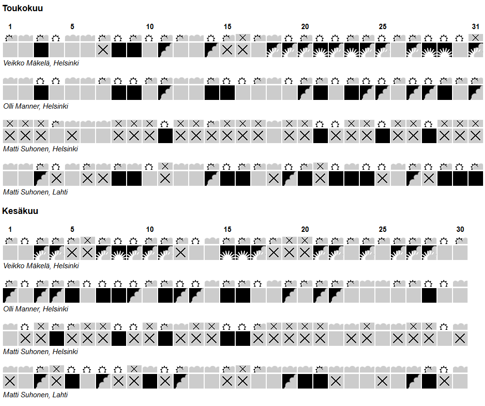 Kelikalenteri touko-kesäkuu 2015 Sää ja havainto-olosuhteet 15.9.2015 0 Klikkaa kuvaa avataksesi kelikalenterin täyskokoon. Kelikalenterin toteutus: Ilkka Santtila
