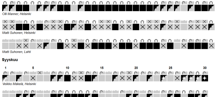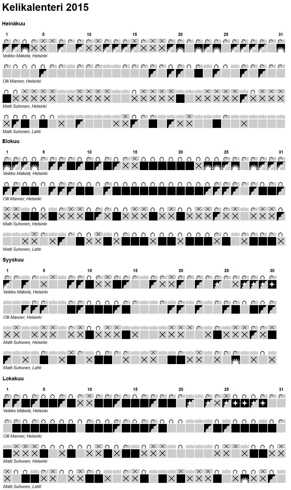 Kelikalenteri heinä-lokakuu 2015 Sää ja havainto-olosuhteet 14.12.2015 0 Klikkaa kuvaa avataksesi kelikalenterin täyskokoon. Kelikalenterin toteutus: Ilkka Santtila