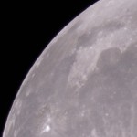 Kuva 3. Aldebaran on tullut Oulun Puolivälikankaan observatoriossa esiin Kuun pimeän reunan takaa 30.10.2015 kello 1.27.47. Aldebaran näkyy pienenä pisteenä Mare Crisiumin vasemmalla puolella pienen puoliksi valaistun kraatterin yläpuolella. Kuva: Jussi Kantola.