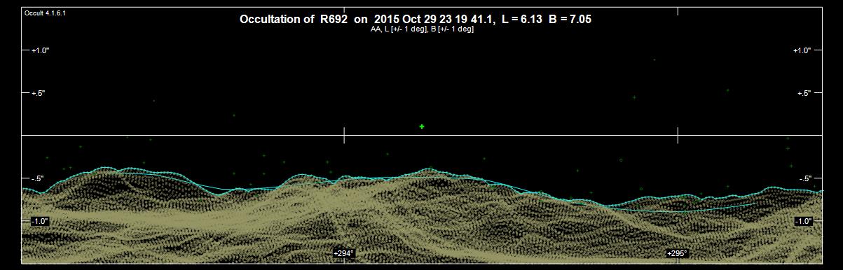 Kuva 11. Esiintulohavaintoni tarkkana Kuun reunan profiilina. Vihreä plus-merkki kuvan keskellä esittää Aldebaranin paikkaa Kuun reunalla. Vaakasuora viiva kuvaa Kuun sileää reunaa. Kuvan alareunassa olevat luvut +294° ja +295° ovat Kuun akselin suunnan suhteen laskettuja suuntakulmia. Kuvan yläosassa ovat havaintohetki sekä Kuun libraation arvot. Jos kuvaa kierretään 90 astetta vastapäivään, se vastaa Kuun näkymistä kaukoputkessa.