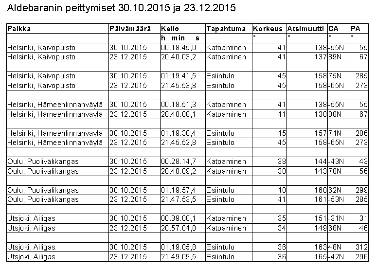 Joulun aaton aattona 23.12. Aldebaranin peittyminen on havaittavissa Helsingissä kello 20.40. Täysikuu on kaksi päivää myöhemmin. Kuusta näkyy 96 prosenttia valaistuna.