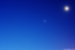 Jesse Kyytinen ikuisti planeettojen yhteispotretin Jyväskylän taivaalla aamulla 8.10.2015. Kuvassa kuunsirpistä vasemmalle Venus, Mars ja Jupiter. Venuksen vieressä on Leijonan Regulus.