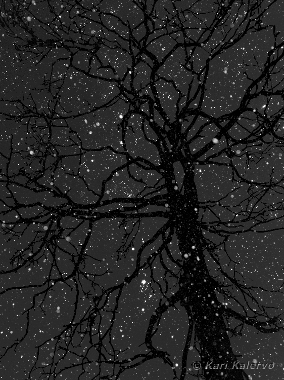 Kelon edessä olevat valopisteet ja pallukat ovat tietenkin lunta. Taivaalla on sekaisin tähtiä ja lumihiutaleita, mutta niitä on vaikea erottaa toisistaan. Suurin osa taivaan valopisteistä on kuitenkin tähtiä. Kuvan yläosaan kätkeytyy puolittain oksien taakse peittyvä Kassiopeian tähdistö.