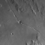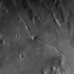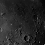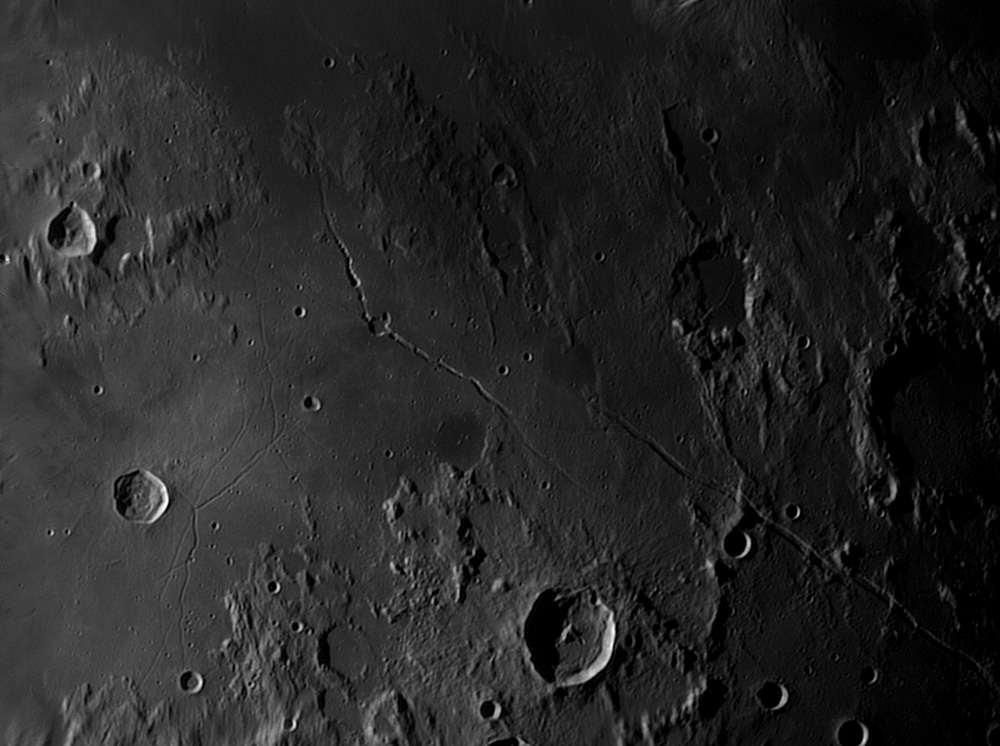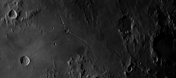 Kuva 1. Rima Hyginus (vasemmalla) ja Rima Ariadaeus (keskellä) muodostavat yli 450 km pitkän tektonisen rakenteen, joka on yhteydessä myös alhaalla vasemmalla näkyvään Rimae Triesneckeriin. Kuva: Rauno Päivinen, Imatra, 7.4.2014, Celestron C14 polttotasosta ASI120MM-kameralla, Baaderin IR-Pass 685 ‑suodin.