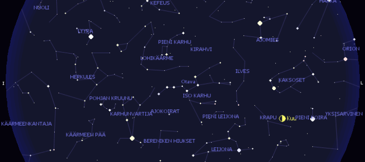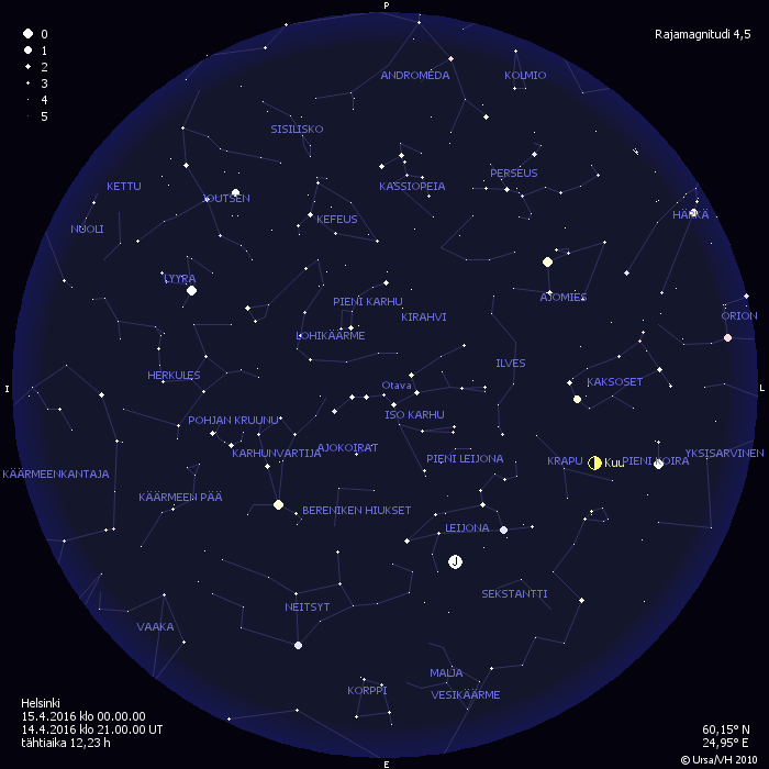 Leijonan tähdistössä majaileva Jupiter on hyvin näkyvissä läpi koko yön. Mars ja Saturnus on mahdollista havaita hyvin matalalla etelän suunnalla ennen auringonnousua. Molemmat planeetat majailevat huhti-toukokuussa Käärmeenkantajan tähdistössä.