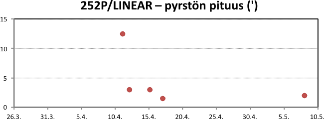 252P/LINEARin komahavainnoissa on suurta hajontaa (kuva 7). Mittausarvot vaihtelevat 7–70 kaarisekunnin välillä. Suuri määrä on 20’ ympärillä. Osittain tällainen haulikkokuvio selittyy havainto-olosuhteilla: Huhtikuun alussa komeetta oli alkuun varsin matalalla, jopa aamuhämärässä. Sen noustua ylemmäs huhtikuun 20. päivän tienoilla kuutamo vaikeutti koman näkymistä. Toki havaintoinstrumenteilla, havaintopaikalla sekä valotusajoilla on vaikutusta.