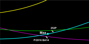 Samankaltaisuus ei helposti ollut nähtävissä tämän kertaisissa lähiohituksissa. 252P kulki eteläisellä taivaalla mm. Jäniksen, Kyyhkysen, Pöytävuoren, Oktantin ja Alttarin kautta ja nousi Skorpionin läpi Käärmeenkantajaan näkyviin Suomen taivaalla. P/2016 BA14 taas kulki aivan toista reittiä Ison koiran, Yksisarvisen ja Kravun kautta Pieneen leijonaan ja Isoon karhuun ja edelleen Karhunvartijan kautta Herkulekseen.