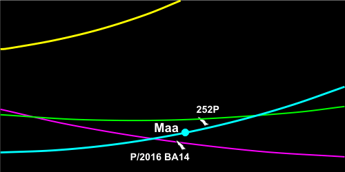 Maaliskuun 21. ja 22. päivinä maapallon ohitti kaksi komeettaa, kumpikin poikkeuksellisen läheltä. Näistä jälkimmäinen P/2016 BA14 (PANSTARRS) ohitti Maan vain 3,54 miljoonan kilometrin eli 0,024 au:n etäisyydeltä. Tämä vastaa yhdeksänkertaista Kuun etäisyyttä. Toinen ohittaja 252P/LINEAR kulki sekin varsin läheltä, 5,33 miljoonan kilometrin eli 0,036 au:n päästä. Tämä on 14 Kuun etäisyyttä.