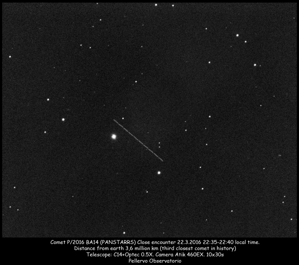 Maaliskuussa kaksi komeettaa ohitti maapallon poikkeuksellisen läheltä. Molemmat havaittiin Suomessa, joskin vain P/2016 BA14 (PANSTARRS) lähimmän ohituksen aikaan. Edellä mainitun arvellaan irronneen toisesta ohittajasta 252P/LINEARista. Viimeksi mainittu puolestaan kirkastui jopa paljain silmin nähtäväksi.