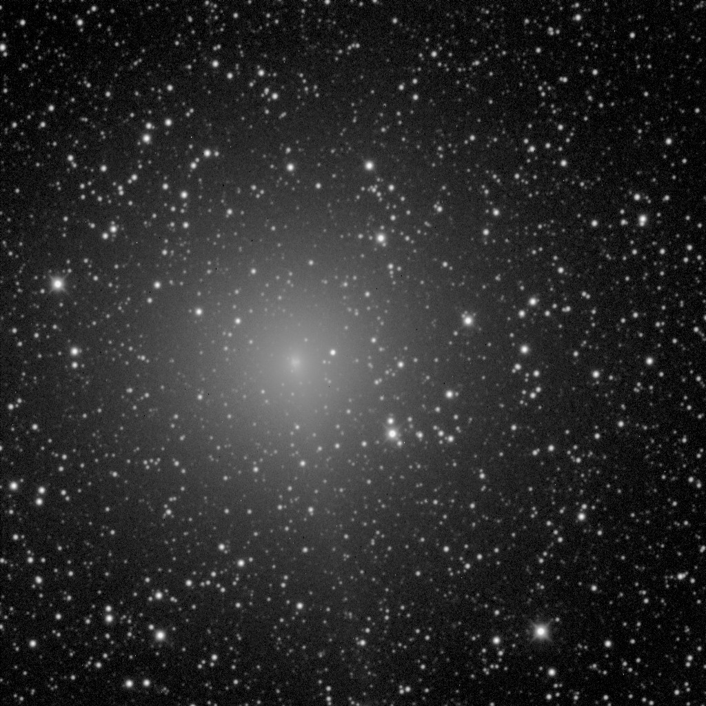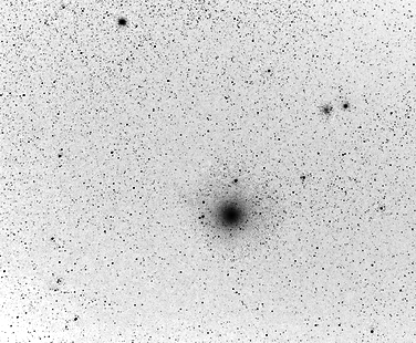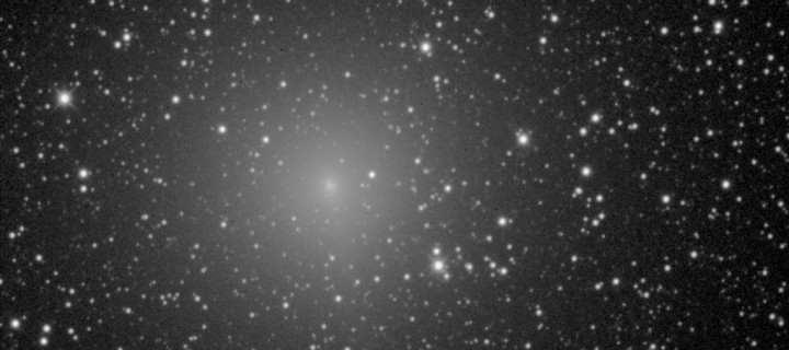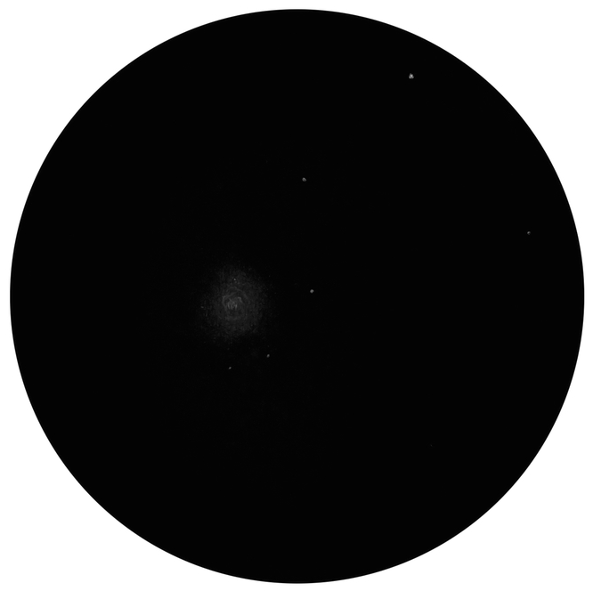 Kuva 4b. Osasuurennos ja mustavalkoinen negatiiviversio Samuli Ikäheimon kuvasta. Kuvassa erottuu selvästi koman sisempi ja ulompi hiukan epäsymmetrinen osa. Kuvankäsittely Veikko Mäkelä.