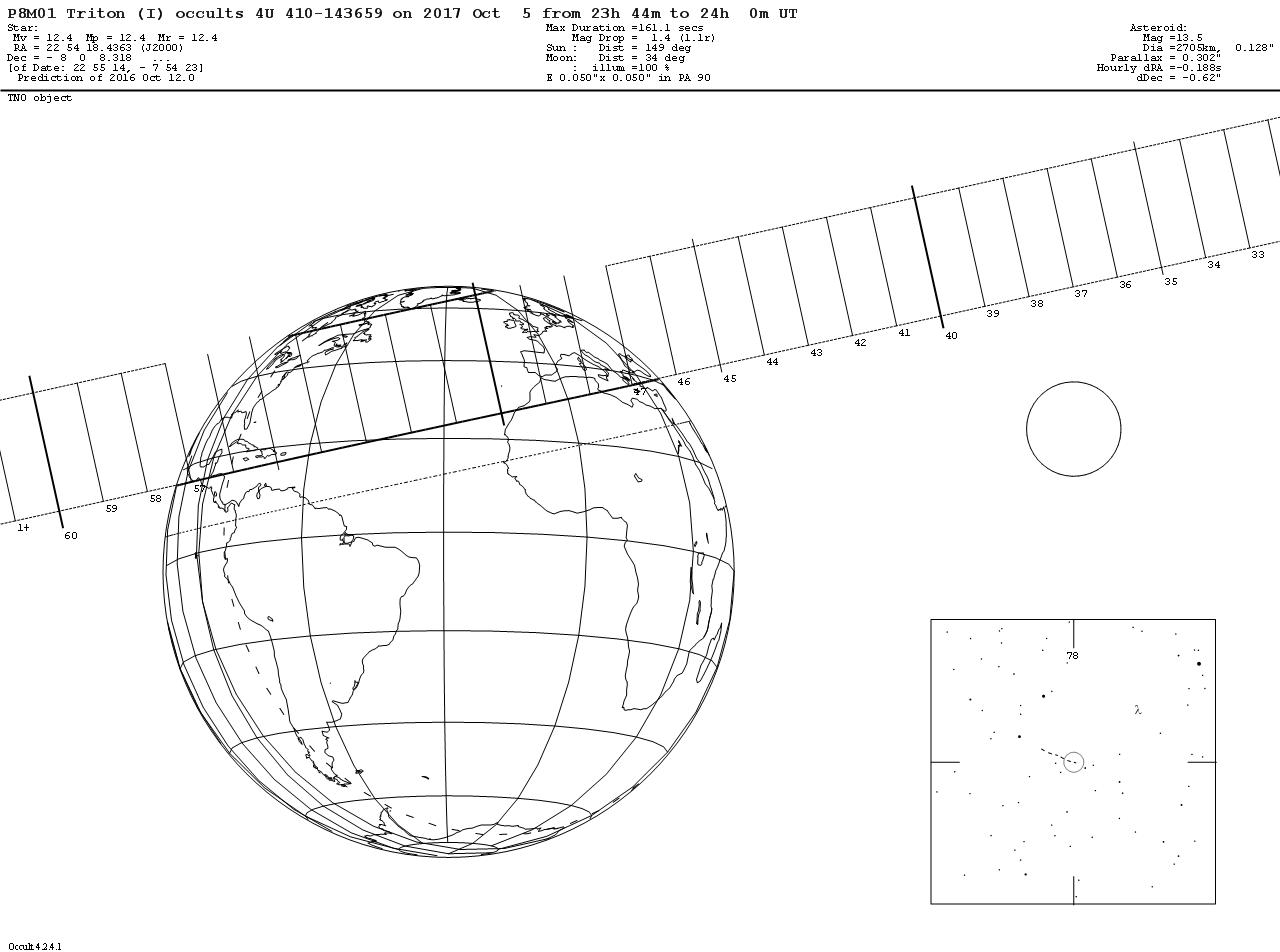 Kuva 1: Triton peittää tähden kuvan osoittamalla alueella 5./6.10.2017. Tritonin varjo kulkee oikealta vasemmalle. Peittymisalueen alareunaan on merkitty tapahtumien yleisajan mukaiset ajankohdat minuutin välein klo 23.32:sta lähtien. Täydet kymmenet minuutit on merkitty pidemmällä viivalla. Maapallon oikealla puolella oleva pyörylä vastaa Tritonin kokoa. Pieni kartta esittää Neptunuksen liikettä lambda Aquariin lähellä. Kahden asteen levyinen kartta ulottuu magnitudiin 12. Peittyvä Triton liikkuu kohti pienen ympyrän keskipistettä.