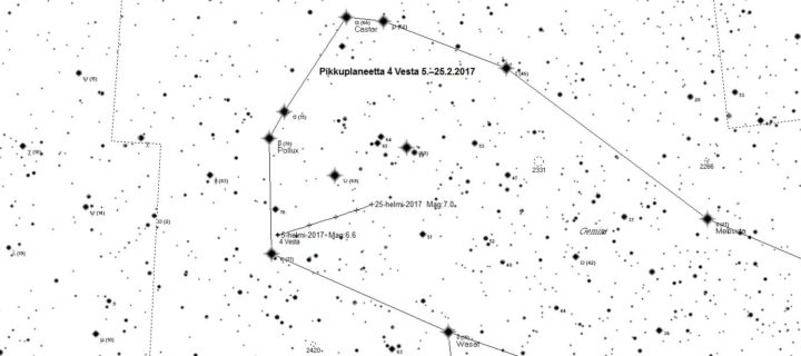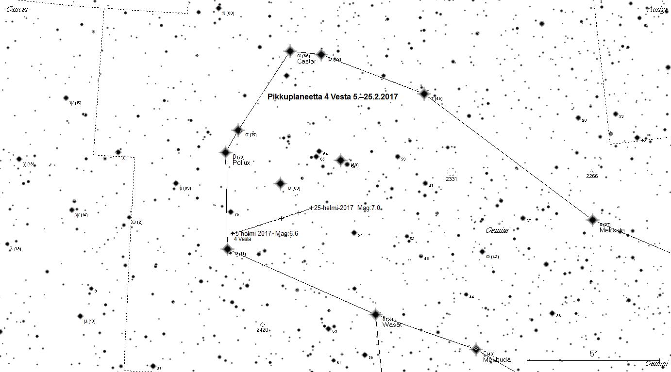 Asteroidi 4 Vesta oli oppositiossa tammikuun puolivälissä. Pikkuplaneettaa voidaan havaita kiikarilla maaliskuun alkuun saakka. Vesta liikkuu helmikuussa Kaksosten κ-tähden läheltä länsiluoteeseen υ-tähden lounaispuolelle. Kartassa Vestan sijainnit on merkitty viiden päivän välein pienillä plusmerkeillä.
