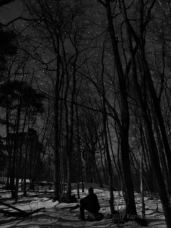 Päivällä, Auringon paistaessa teen kauaskantoisia kuvaussuunnitelmia. Kun sitten pimeys laskeutuu ja pakkanen kiristyy, lähtökynnys nousee kovin korkealle. Vihdoin kylmään ja pimeään metsään astellessani homma alkaa tuntua taas mielekkäältä. Tunnin luonnossa vaeltelun ja kuvaamisen jälkeen haluan vain pysähtyä aloilleni ja ihmetellä kokemaani.