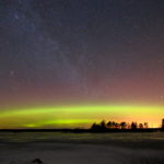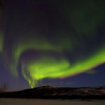 Kameran näytöllä tosiaan erottui reposia, niinpä oli jäätävä odottelemaan. Noin puoli yhdentoista aikaan alkoi tapahtua ja kirkkaus lähti selvään nousuun. Huomasin, että kaari oli huomattavan korkealla verrattuna vaikka tämä vuoden aiempiin reposiltoihin. Ei mennyt kauaa, kun ensimmäiset säteet nousivat esiin kaiken keskeltä. Siinä ne liikkuivat hiljakseen voimistuen. Koronaa ei tälläkään kertaa näkynyt, mutta selvää viherrystä oli nähtävissä melkein pään yläpuolella asti. Nukkumaan mennessä huomasin, että se kaikki väsy olikin kummasti kaikonnut tiehensä.
