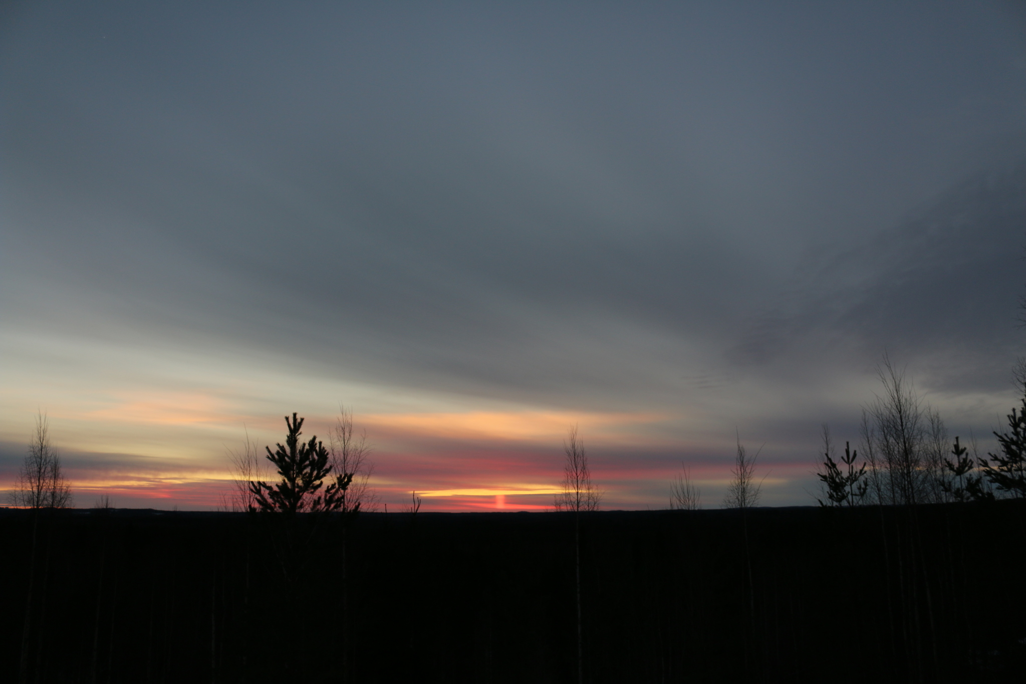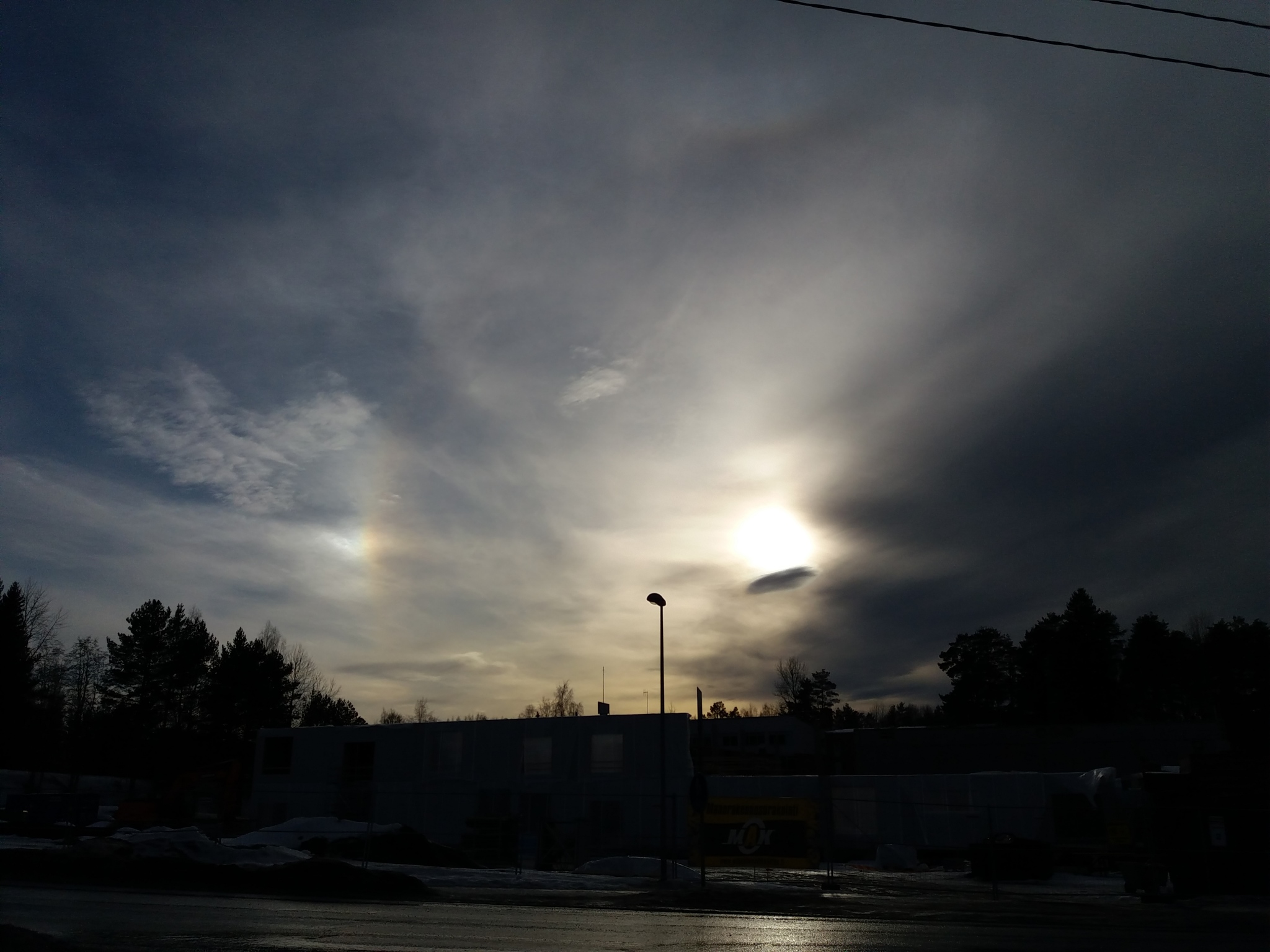 Ohessa Jakokoskella (tähtitornilta otettu kuva) helmikuussa kuvattu halo, auringonpilari. Reilu puoli tuntia näkyi ja erittäin selkeärajaisena, puhumattakaan leveydestä (tasainen myös ylhäältä). Parina peräkkäisenä päivänä taivas hehkui pitkään oranssin punaisena helmikuussa, joista toisena päivänä otetet kuvat.