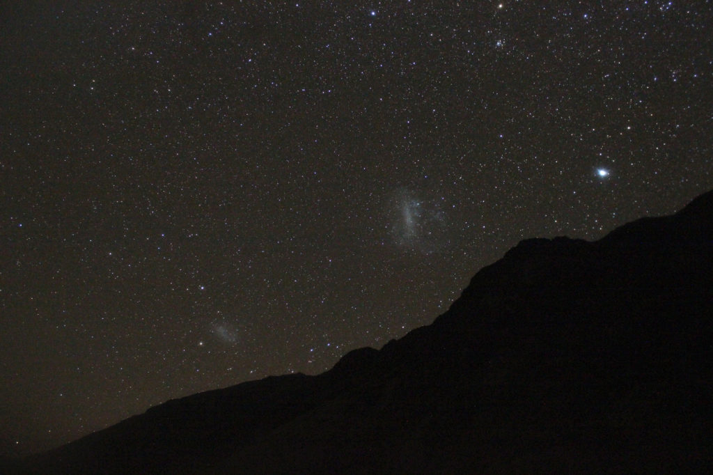 Jäin pitkiksi ajoiksi vain seurailemaan Linnunradan keskuspullistuman yksityiskohtia ja pimeitä sumuja sen helmoissa. Mutta galaksimme ollessa tuossa asennossa, lähes pystysuorassa horisontista, katse väkisinkin liukuu kuin kiihdytyskaistaa pitkin yhä ylemmäs, kunnes se tavoittaa Alpha ja Beta Kentaurin ja sen takana Etelän ristin ja sen iäisen kumppanin Hiilisäkkisumun. Tietävälle seuraava automaattinen suunta on Etelän ristin osoittamaan suuntaan, etelää kohti. Risti – tai leija, kuten sen itse aina näen – osoittaa kohti eteläistä taivaannapaa. Eteläntähteä ei ole, mutta paikan voi löytää monellakin keinolla. (Esimerkiksi kulkemalla 4,5 kertaa Etelän ristin pidemmän akselin halkaisijan verran siihen suuntaan, mihin risti näyttää). Taivas on sillä kohtaa tyhjä, joten katse ei siinä kauaa pysy. Vain hetkellinen ajatus siitä, että tuo kohta on suoraan etelänavan yllä. Toisen mietteen uhraan sille, että Pohjantähti on tarkalleen toisella puolella taivaanpalloa. Sitten katse lipuukin jo tuon kohdan ohi, kuin magneetin vetämänä kahteen laakeaan ututäplään, jotka lipuvat taivaalla hyvin lähellä etelän lakea.