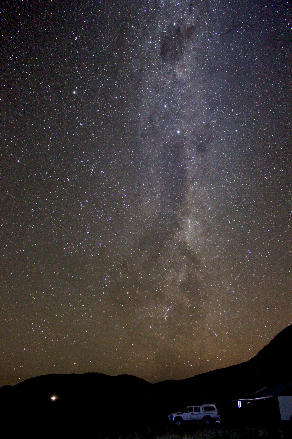 Uudessa-Seelannissa ohjelmassa oli ensin matka Helmin syvänteeseen örkkejä etsimään. (Varsinkin Eteläsaarella on paljon Taru sormusten herrasta -leffojen kuvauspaikkoja, tukikohtana käyttämämme metsästysmajan pihalle näkyi myös Edoras). Vietimme Rangitata-joen yläjuoksulla pari yötä, jotka sattuivat myös olemaan kristallinkirkkaita ilman ensimmäistäkään pilvenhattaraa. Valosaasteesta ei ollut haittaa paikassa, jossa ei ole edes kännykkäkuuluvuutta. Siksipä etelän tähtitaivas näyttäytyikin koko loistossaan. Taivaan pimetessä Skorpioni loikoili mukavasti pötköllään horisontissa, josta se yön edetessä pikkuhiljaa hivuttautui saksiaan naksutellen taivaanlakea kohti. Sitä seurasi pystykenossa Jousimiehen Teekannu, joka tuossa asennossa näytti kaatavan eteläisiä Messierin kohteita nokastaan. Ihailin taivasta sillä kertaa vain paljain silmin, mutta esimerkiksi M7 oli tietysti huikaiseva jopa ilman sen kummempia optiikoita.