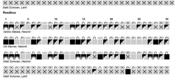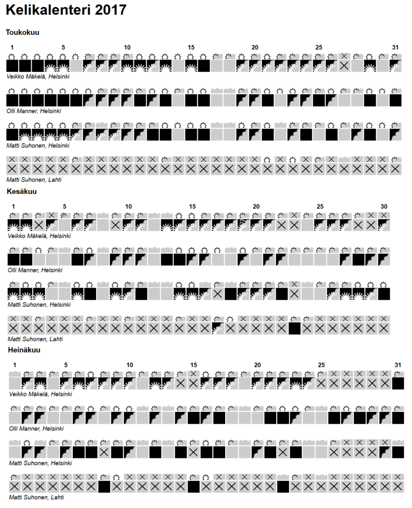 Kelikalenteri touko-heinäkuu 2017 Sää ja havainto-olosuhteet 21.9.2017 0 Napsauta kuvaa avataksesi kelikalenterin täyskokoon. Kelikalenterin toteutus: Ilkka Santtila