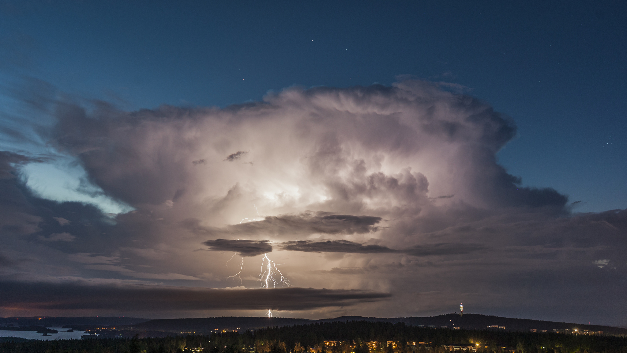 Tätä voisi pitää jonkinmoisena erävoittona tämän vuoden ukkosille, ehdottomasti parhaat omalle kohdalle. Yhdentoista jälkeen puhelin alkoi piippaamaan, myrskybongarien whatsapp ilmoitti lähestyvästä rintamasta. Vilkaisin ukkostutkaa ja luulin jo olevani myöhässä, toisin kävi kun ensimmäinen solu vyöryi juuri sopivaan aikaan puiden välistä näkösälle. Show kuitenkin hiipui pikkuhiljaa ja suurin osa muista bongareista paineli nukkumaan. Lupaavan oloista kumpuilua syntyi koilliseen ja ei mennyt kauaa kun solu kehittyi melko mukavasti kipunoivaksi alasimeksi. Toki mitään salamaennätystä ei tullut, mutta kuvausmielessä saanti oli pitkän valotusajan takia lähempänä 100% nähdyistä salamoista. Laskin kuvista noin 50 välähdystä, horisontissa varmasti olisi lisää jos jaksaisi kaikki tuhatkunta kahlata läpi.