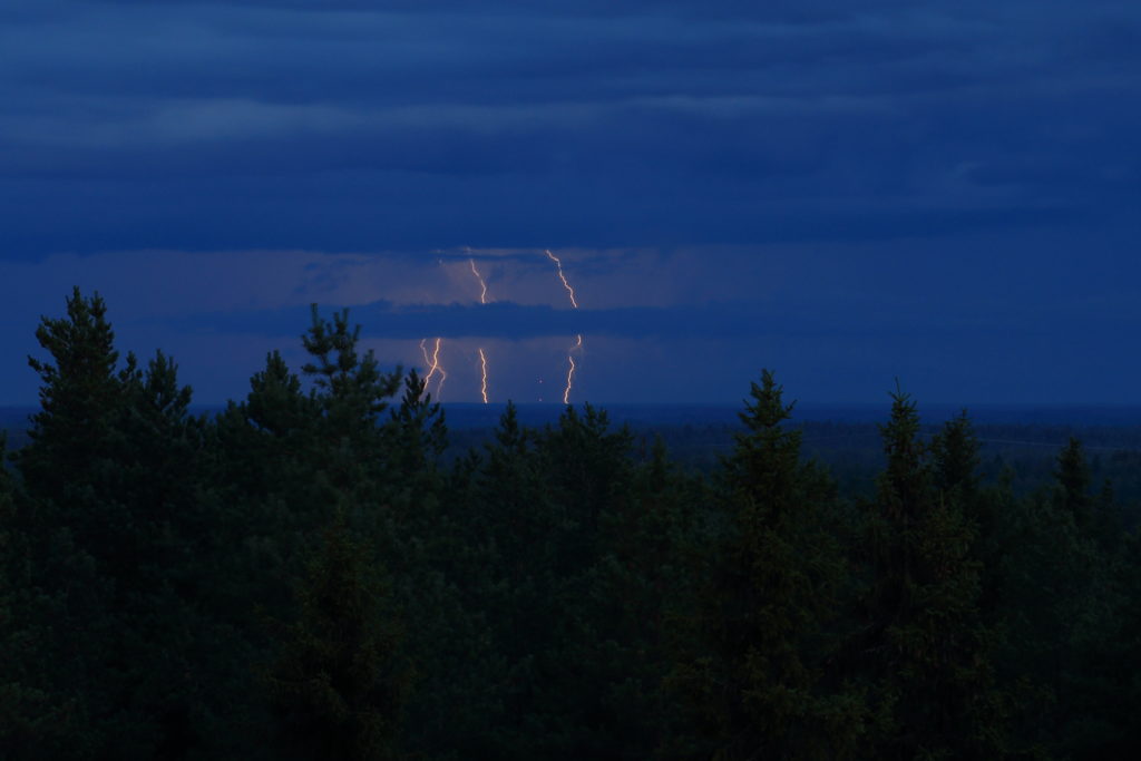 Elokuun 2. ja 3. yö tarjosi salamoiden kuvaamisen, kaukana räiskyivät ja lähimmillään Lumijoen takana. Kuva Siikalatvan salamoinnista Kempeleen Köykkyrinteeltä kuvattuna.