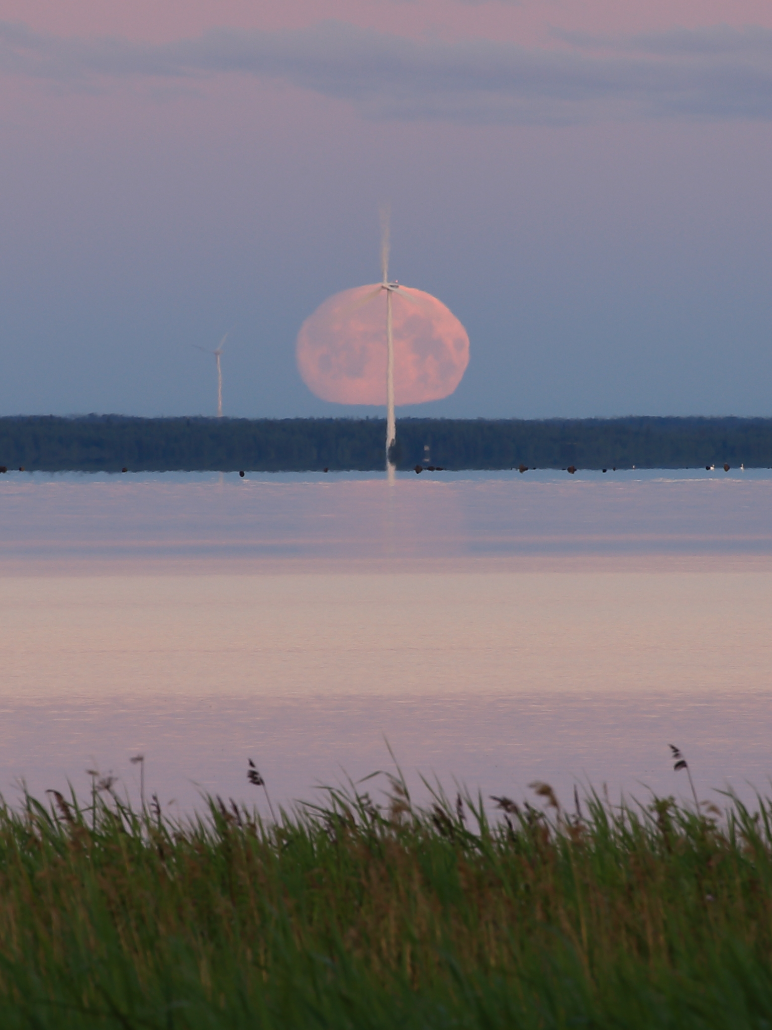Pitkäaikainen tavoite vihdoin onnistui käyttämättä mitään apuohjelmia sijainnin ja Kuun laskun kohdan määrittämiseen. Taaemmas on vain ehtinyt nousta vähän useampi tuulivoimala. Juuri ja juuri riitti ranta-alueella tila kuvaamiseen esteettä ja juoksemaan joutui aina uuteen paikkaan jotta sai useamman kuvan Kuu voimalan takana.