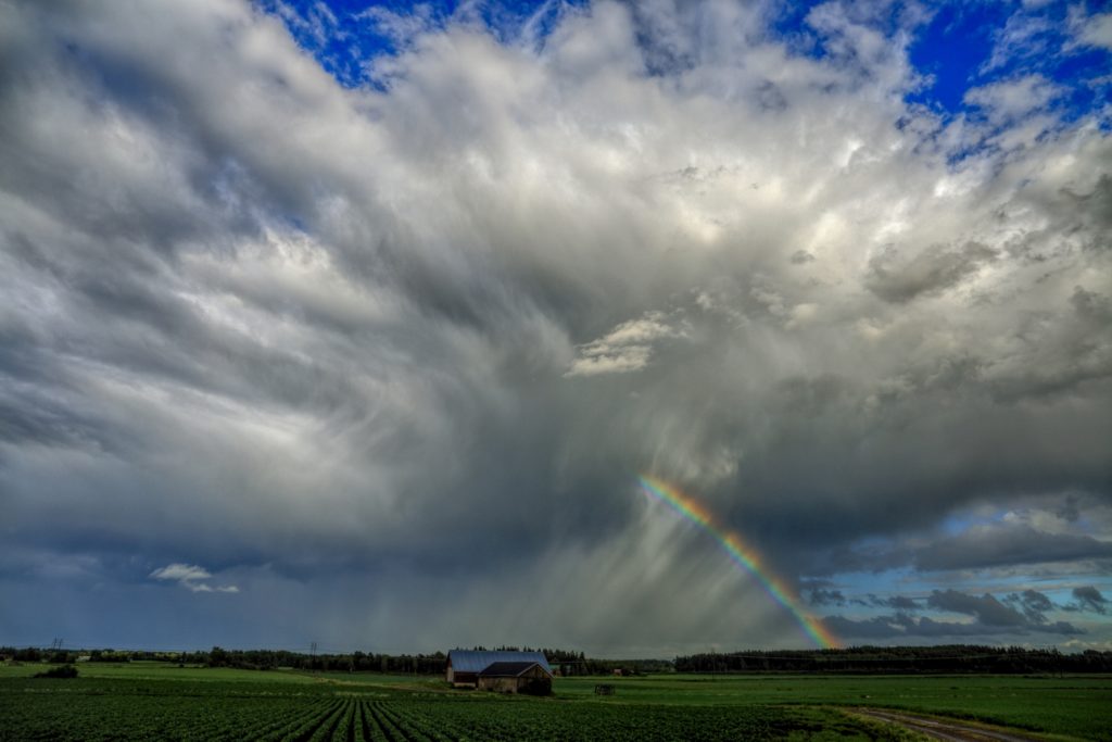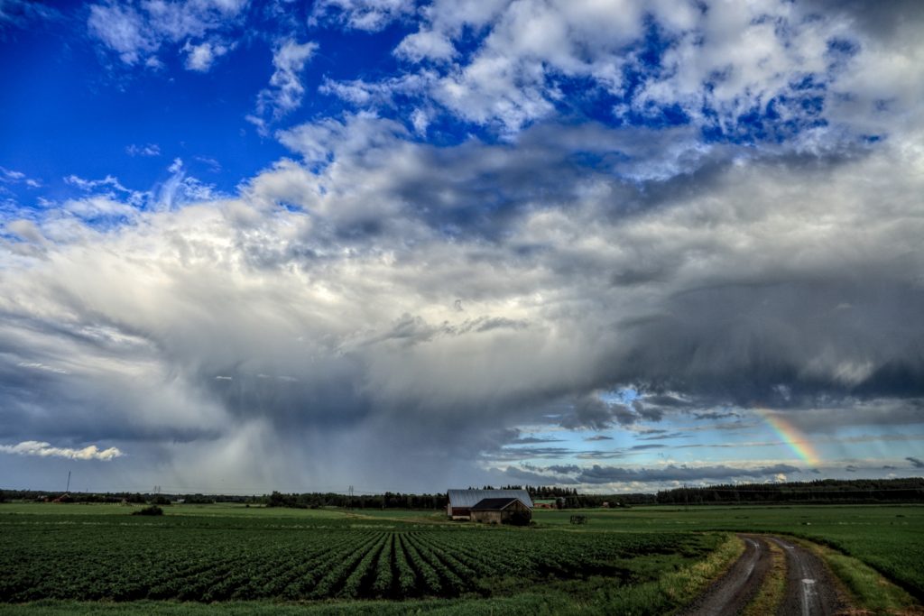 25.6.2017 ukkosteli Laitilassa, mutta lähes tulvimalla satanut sade ei antanut mahdollisuutta päästä kuvaamaan kuin vasta ukonilman mentyä. Upea pääsateenkaari ja sadejuovat jäivät kuviin.