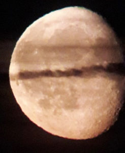 Illan pimenemistä ja tähdenlentoja odotellessa nousevan kuun seurantaa Laukaassa 11.8.2017. Nousun ”mittatikkuna” Kuun edessä ollut ohut pilvikerros. Katselupaikka korkealla (210 m mpy) ja kuu tuolloin matalalla horisontissa.