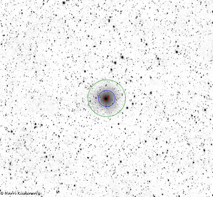 Kaaviokuva viereisestä Harri Kiiskisen viereisestä kuvasta. Kaavioon on merkitty koman keskuskirkastuma (punainen pisteviiva), peruskoma (sininen) ja ulompi koman himmeä osa (vihreä).