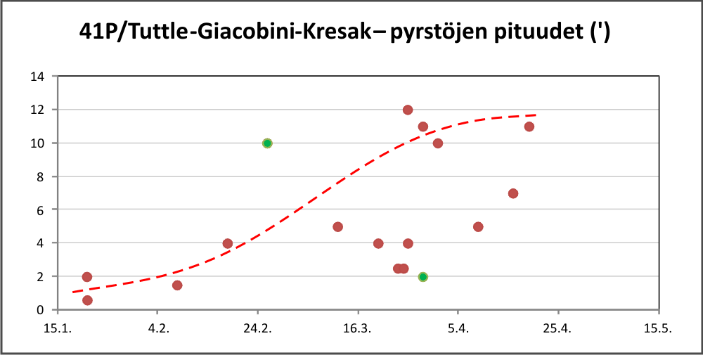 Ensimmäiset havainnot 41P/T-G-K:sta saatiin jo 20.1. Tähtikallion havaintokeskuksen havaintoryhmän Miettinen–Laihia–Määttänen toimesta. Samana yönä seuraavan vuorokauden puolella myös Jorma Ryske kuvasi kohteen. Siitä havaintokausi jatkuikin reilut neljä kuukautta. Viimeisestä havainnosta vastasi puolestaan Tapio Lahtinen 1.5. Kangasalla. Komeetta oli runsaimmin havaittu kevään pyrstötähdistä.