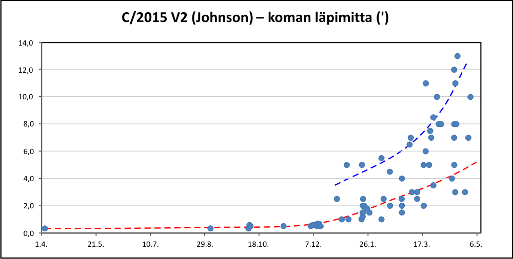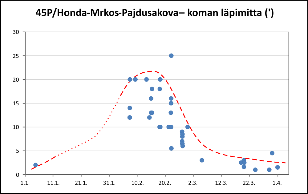 Koma kasvoi tammikuun vajaan kaariminuutin mittaisesta lähiohitushetken jopa 30–40’ läpimittaan hiipuen taas toukokuun alkuun noin 15 kaariminuuttiin. Havainnoissa on paljon hajontaa, mutta ne kuvastavat aika hyvin komassa näkynyttä kolmiosasta rakennetta. Havainto-olosuhteet, instrumentin koko ja käytetyt valotusajat tuovat esiin kunkin rakenneosan. Sisimpänä näkyy vajaan 10’ keskuskirkastuma, sen ulkopuolella melko helposti erottuva noin 20’ peruskoma ja parhaiten valotetuissa kuvissa himmeä laaja 30–40’ mittainen ulko-osa. Huhtikuun lopulle tultaessa erottuvat enää keskuskirkastuma ja peruskoma.