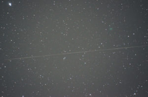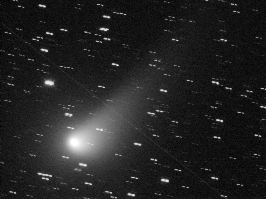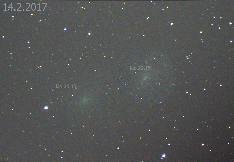 41P/Honda-Mrkos-Pajdusakova, 14.2.2017, Nikon D7000, 300 mm, f/5.6, 124 s, ISO 1600. Komeetan liike kahden tunnin aikana näkyy selvästi. Kuva: Voitto Pitkänen.
