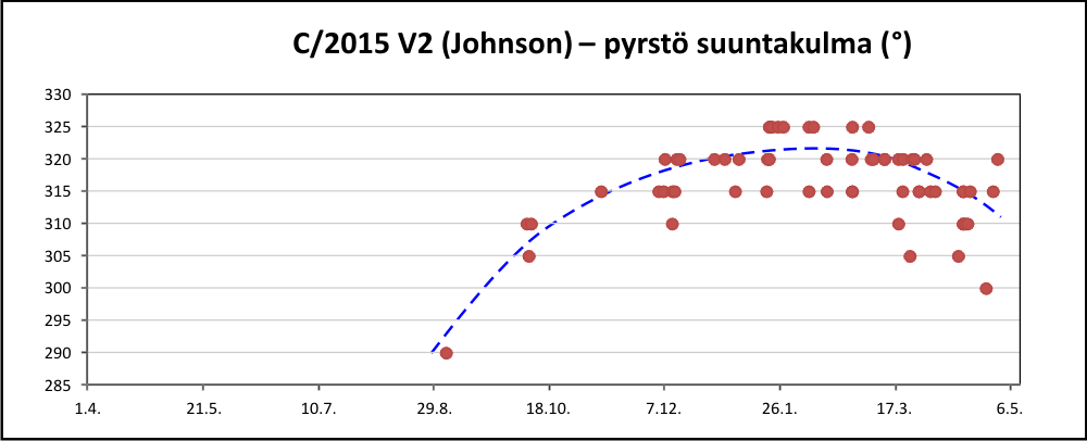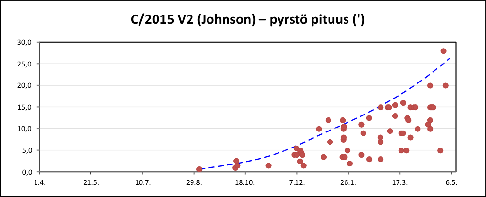 C/2015 V2 (Johnson), 15.4.2017. 305 mm, f/4, Atik 314L+, 5 × 10 min. Huomaa pyrstön alareunan leviäminen, kuva: Timo Kantola.