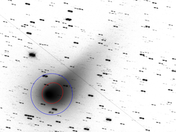 Kaaviokuva viereisestä Timo Kantolan viereisestä kuvasta. Kaavioon on merkitty koman sisäosa (punainen pisteviiva) ja ulompi himmeämpi osa (sininen).
