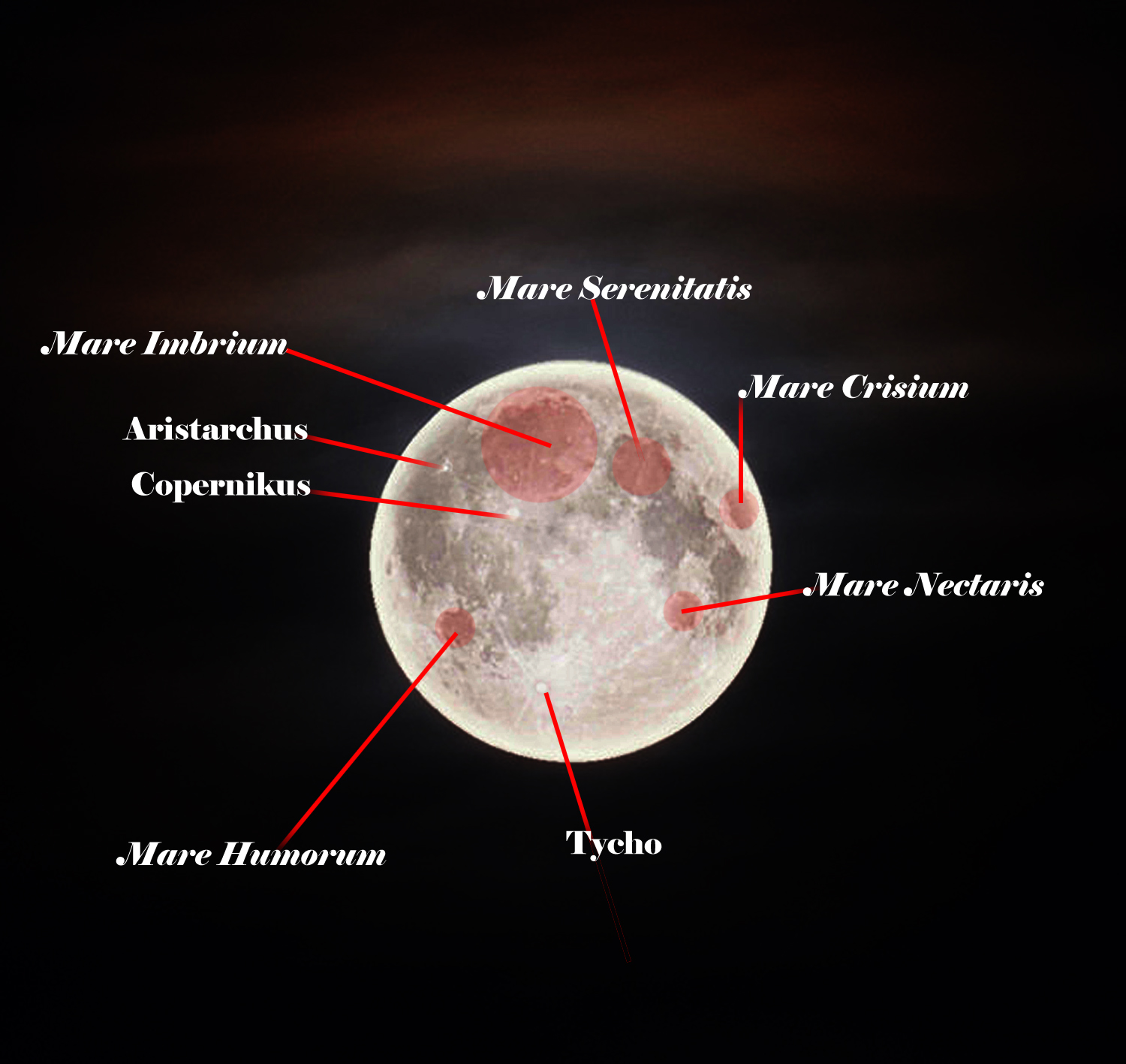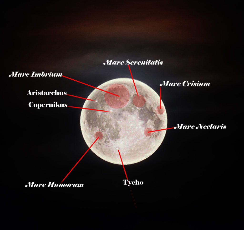 Kuu kirkas, väriltään kuparinpunainen tai oranssi. Umbrassa näkyy kirkas sininen reuna. |
