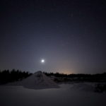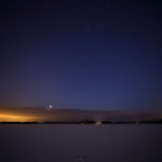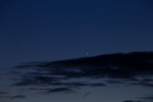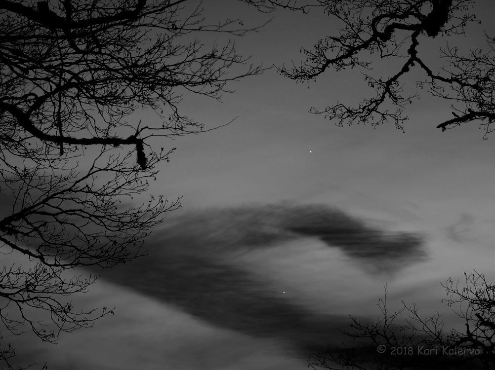 Merkurius ja Venus kohtasivat maaliskuun alussa. Valokuvasin planeettoja 7.3., kun pahimmat pakkaset hellittivät. Merkurius oli hyvin kirkas, jopa -1.0 magnitudia, ja näytti kameran etsimessä suunnilleen yhtä kirkkaalta kuin pilviverhon reunassa piileskellyt Venus. Tavoittelin mieluummin taidekuvaa kuin kirkkausdokumenttia, joten pilvien sävyt olivat tervetullut lisämauste.