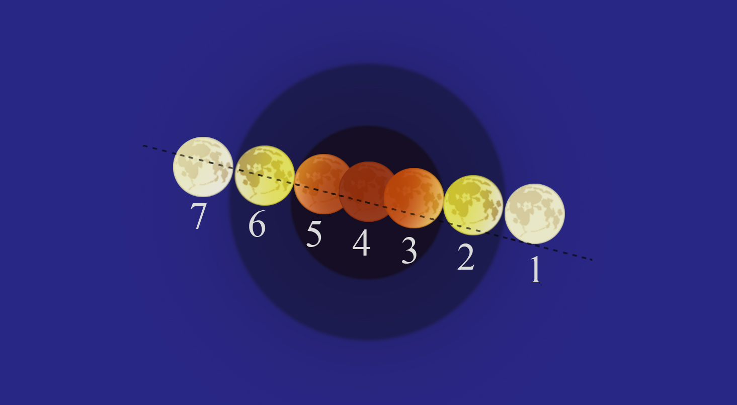 3 Täydellinen vaihe alkaa 22:30 (Kuu siirtyy täysvarjoon eli umbraan)