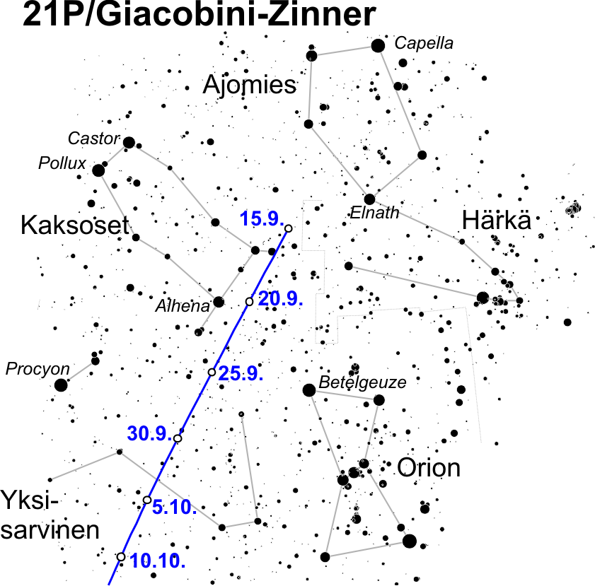 Jo loppukesästä näkyvissä ollut komeetta 21P/Giacobini-Zinner on parhaimmillaan. Periheli ja kirkkain vaihe ohitettiin 10.9.