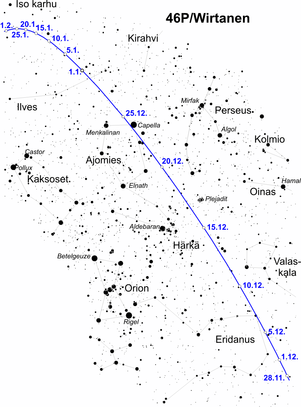 Komeetta 46P/Wirtanen ilmestyy Suomen havaintohorisonttiin marraskuun loppupäivinä Sulatusuunin, Valaskalan ja Eridanuksen rajamailla. Sieltä pyrstötähti nousee nopeaa tahtia Eridanuksen ja Valaskalan välistä kohti Härän tähdistöä. Plejadit kohde ohittaa 17.12. Joulun alla komeetta käväisee Perseuksen kaakkoisnurkassa ja ohittaa jouluaattona Capellan. Siitä matka jatkuu vuodenvaiheessa Ilvekseen ja edelleen tammikuun loppupuoliskolla Iso karhun pään eteläpuolelle.