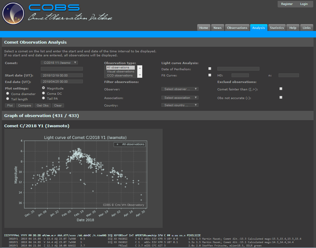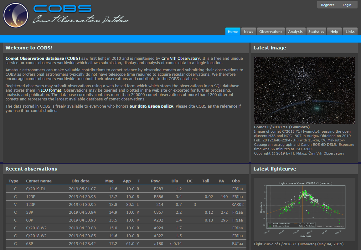 Comet Observation Database COBS on maailman suurin harrastajahavaintojen tietokanta komeetoista liki 250 000 havainnollaan. Sivusto on hyödyllinen osoite komeettahavaitsijan kirjanmerkkeihin. Huhtikuussa saatiin tietokantaan siirrettyä yli 500 suomalaista havaintoa.