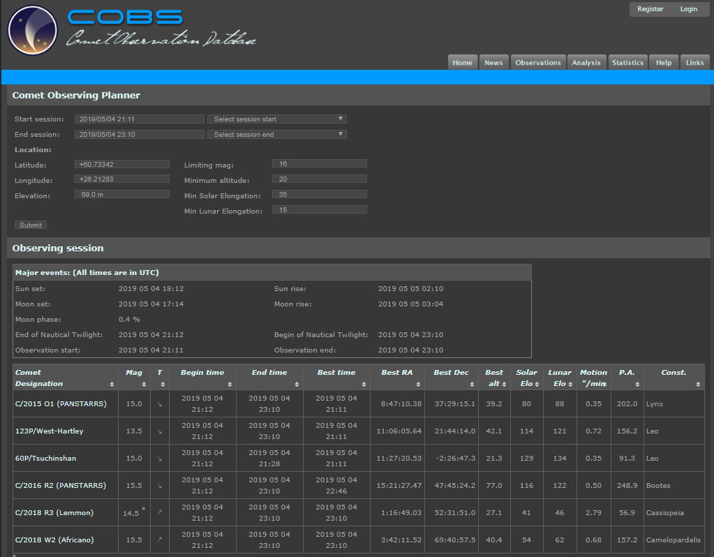 Havaintosuunnitelman tueksi COBS:n etusivulta löytyy listaus näkyvistä komeetoista kirkkausarvioineen. Kustakin annetaan myös leveysasteet, joilla kohde on havaittavissa sekä paras vuorokaudenaika 45. pohjoiselle ja eteläiselle leveyspiirille.
