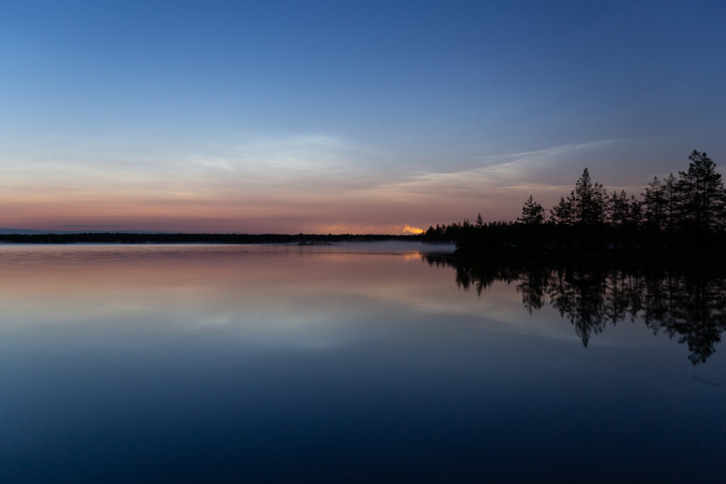 Rauha kun koitti niin olosuhteetkin muuttuivat, järven pinta tyyntyi peilaavaksi ja samalla valaisevat yöpilvet hitaasti lähestyivät oikealta horisontissa. Niitä siinä ehti kuvata lähes kyllästymiseen asti ja toiveena oli että jos vielä revontulet siihen samaan kuvaan. Tunti siinä vierähti kun vihdoin kaari näyttäytyi ja säteitäkin oli ja valaisevat yöpilvet olivat ehtineet siirtyä tavallaan keskelle järvimaisemaa. Ehti siinä muutaman kuvan ottamaan eivätkä samaan aikaan ilmaantuneet kolme uimaria ehtineet kovin pahasti peilipintaa sotkemaan.