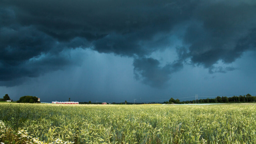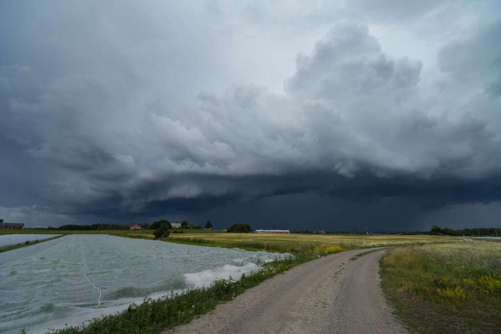 Jyrinän yltyessä otin kamerat ja auton sekä suuntasin keskelle peltoaukeaa. Voi morjens mikä näky avautui peltosuoralla. En kyllä ihan heti unohda sitä. Edessäni murisi hyvin, hyvin vihainen vyörypilvi. Seisautin auton ja nousin ulos.