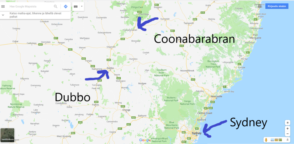 Lopulta valintamme kohdistui itään, koska siellä on Australian tähtitiedepääkaupunki Coonabarabran sekä tietysti Australian suurin kaupunki Sydney, mistä olisi lentäen lyhyt matka Coonabarabraniin. Lisäksi Sydney olisi tietysti itsessään erittäin mielenkiintoinen kohde turistin kannalta! Vietimme matkamme ensimmäisen viikon Sydneyssä, mistä lensimme Dubbo -nimiseen pikkukaupunkiin, josta jatkoimme matkaa vuokra-autolla Coonabarabraniin.