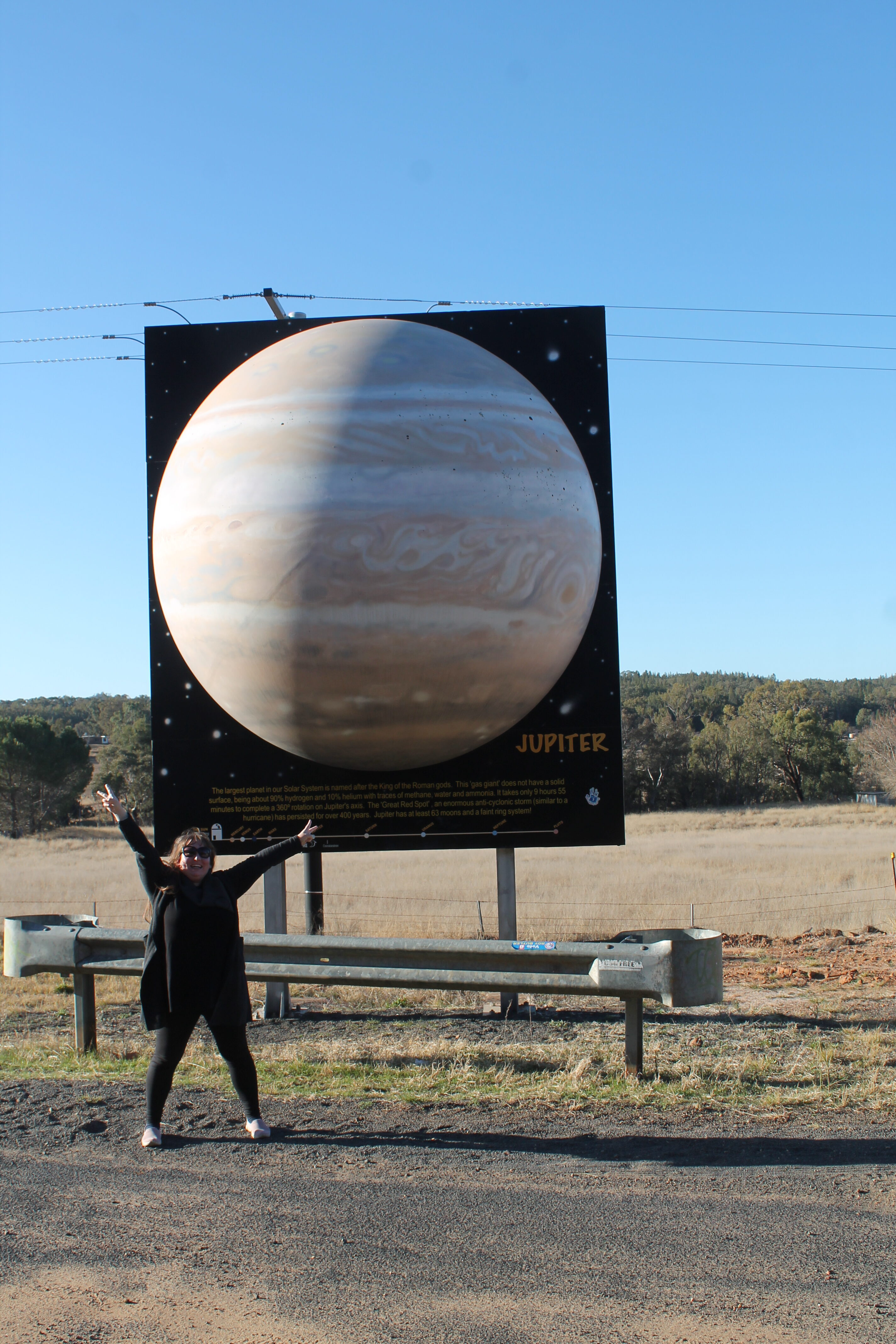 Linda ja aurinkokuntamallin Jupiter. Bongasimme tästä mallista kaikki planeetat Merkuriuksesta Saturnukseen. Uranus ja Neptunus olivat selvästi kauempana, ja niitä emme tälläerää bonganneet.