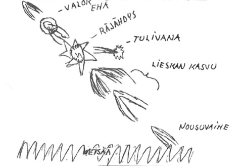 Rakettilaukaisu 16.12.1977 havaittuna Konneveden Istunmäellä. Ilmiö lienee ollut myös bariumkoe. Piirros: Matti Hänninen.