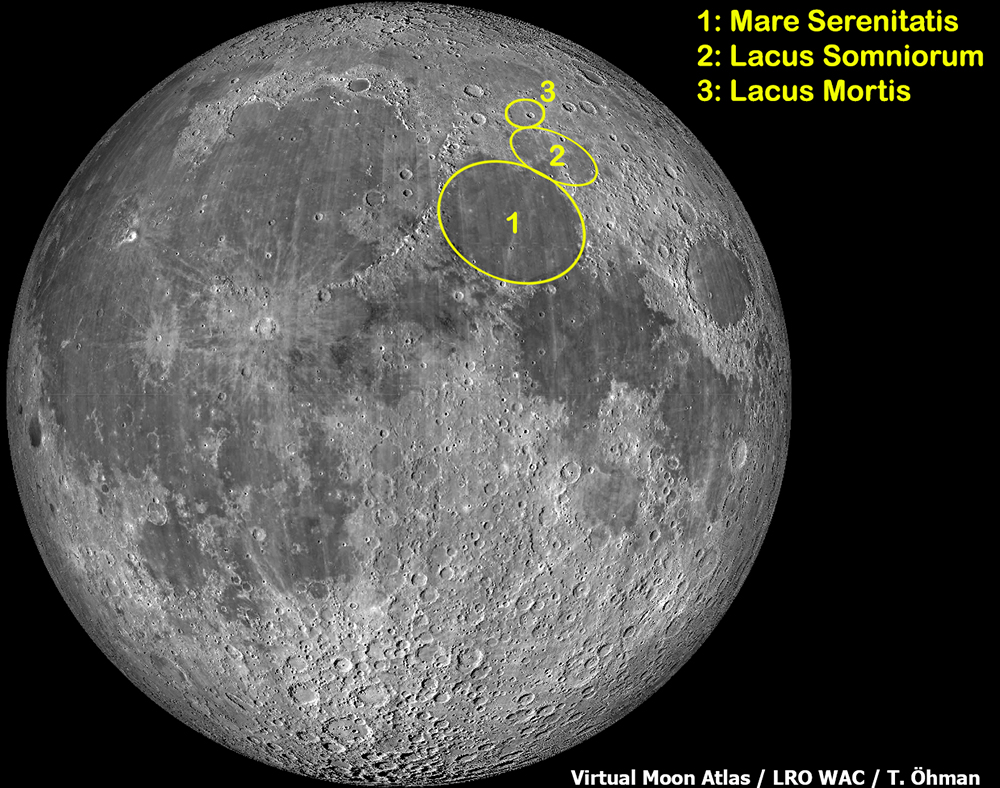 Mare Serenitatiksen, Lacus Somniorumin ja Lacus Mortiksen sijainti kartalla.