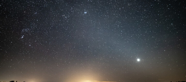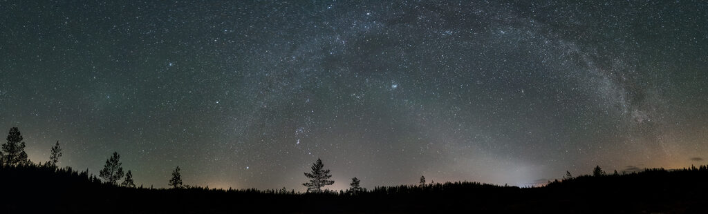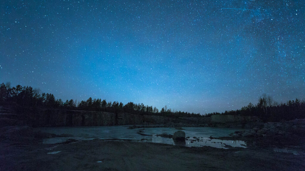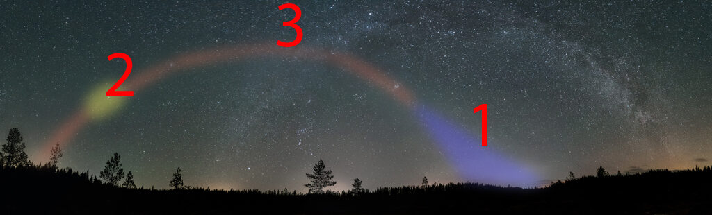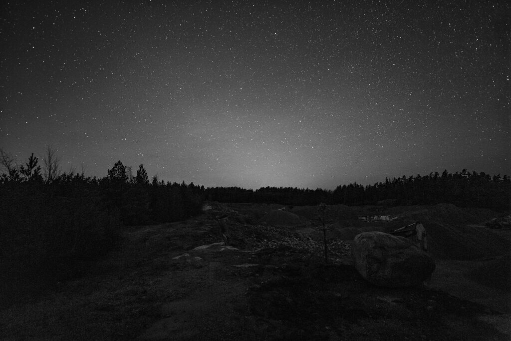 Päätin ajaa Pyhärantaan ajatuksena ottaa maisematähtikuva. Huomioni kiinnittyi kuvauspaikalla taivaalla möllöttäneeseen punertavaan pilveen, joka pikku hiljaa hehkui ja peitti linnunradan ja aaltoili… hetkinen. Onko tuo punainen llmahehkua? Ettei joukossa olisi kiilamainen valo? Tarkastelin tähtiä hetken, jonka jälkeen annoin katseeni hakeutua eläinradan suuntaan ja siitä liukumalla hieman ohi. Jotakin siellä silmän mukaan on. Lähdin hakemalla hakemaan kamerasta säätöjä. Nostin rungosta kontrastia, painoin laukaisijaa ja odotin.