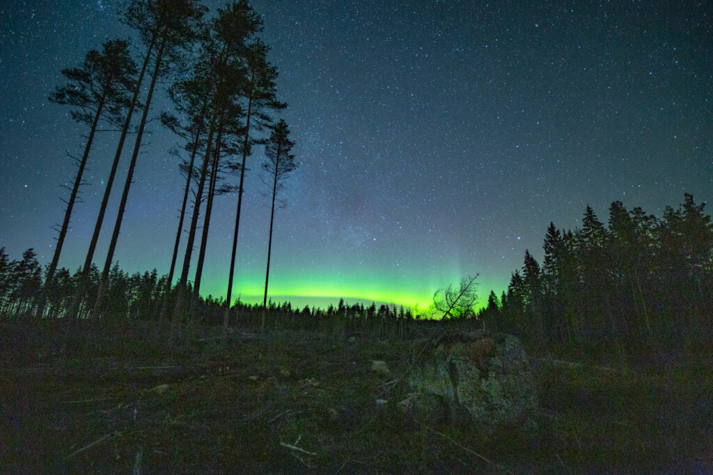 Avasin jalustaa vauhdissa. Nyt vyöstä ilmaantui korkea sädekimppu. Me juoksimme edelleen. Oikaisimme lailla peurain ojan ylitse hakkuuaukealle. Revontulivyö levistyy ja kirkastuu horisontissa.