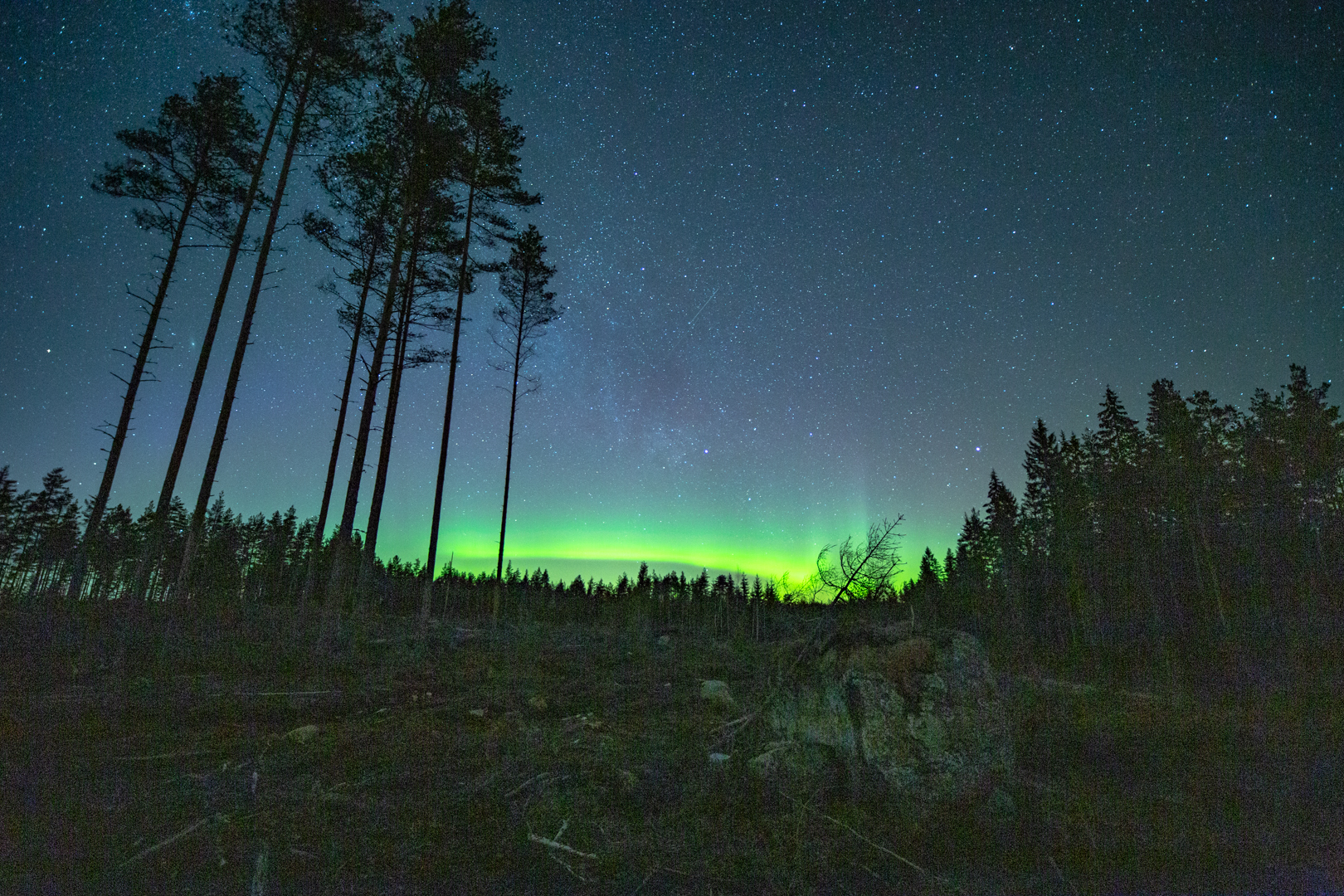 Isäntä sujahti pitkästä aikaa mukaan ja päätimme ajaa karauttaa uusille kuvaushuudeille. Perille päästyämme taivaanrannassa näkyi matala revontulikaari. Kuvauspaikka oli kuitenkin valikoitu eläinratavaloa ja mahdollista vastavaloa varten-ei kp 2,5 korkeudella olevaa revontulikaarta, joka päätti samassa aktivoitua meidän sitä pällistellessä. Se alkoi kirkastumaan silmissä joten pistimme juoksuksi. Pingoimme rinta rinnan tukkitietä pitkin, mäkeä ylös kohti hakkuuaukeaa vyön kirkastuessa ja lähtiessä liikkumaan.